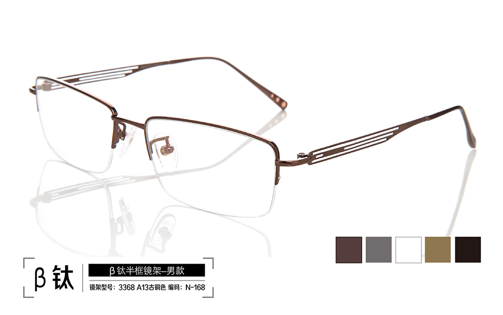 鏡架系列:β鈦半框鏡架 名稱(chēng):β鈦半框鏡架 型號(hào): 3368 A13 古銅色;3368 A03 灰色;3368 A02 白色;3368 A01 金色;3368 A04 黑色 編號(hào): N-168;N-177;N-178;N-179;N-180 |